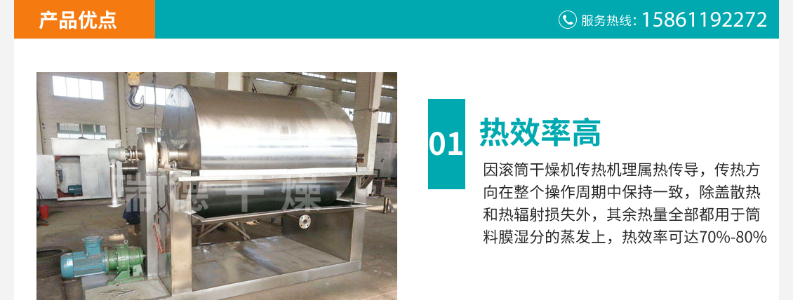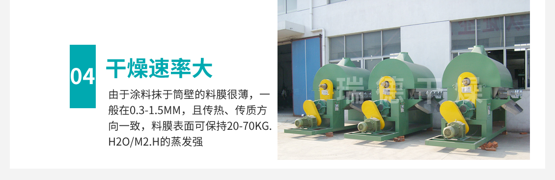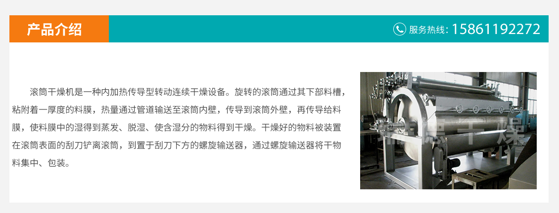 产品描述:滚筒干燥机是一种内加热传导型转动连续干燥设备。旋转的滚筒通过其下部料槽, 粘附着一厚度的料膜,热量通过管道输送至滚筒内壁,传导到滚筒外壁,再传导给料 膜,使料膜中的湿得到蒸发、脱湿、使含湿分的物料得到干燥。干燥好的物料被装置 在滚筒表面的刮刀铲离滚筒,到置于刮刀下方的螺旋输送器,通过螺旋输送器将干物 料集中、包装。
